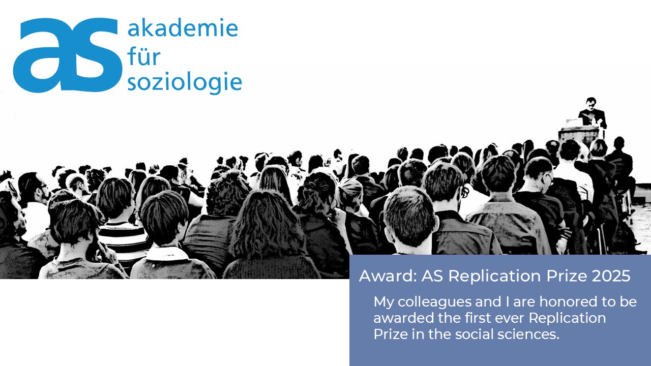 Proud to be awarded the (worldwide) first ever Replication Prize in the social sciences together with Sergio Lo Iacono, Vincent Buskens, Rense Corten, Marcel van Assen and Arnout van de Rijt. Our paper reports the results of an exact multilab replication of a cornerstone experimental study on the competitive advantage of sanctioning institutions. Our replication project was financed by the Duch Science Foundation. The Replication Prize is awarded by the Academy of Sociology, a professional scientific association promoting analytical-empirical social science.