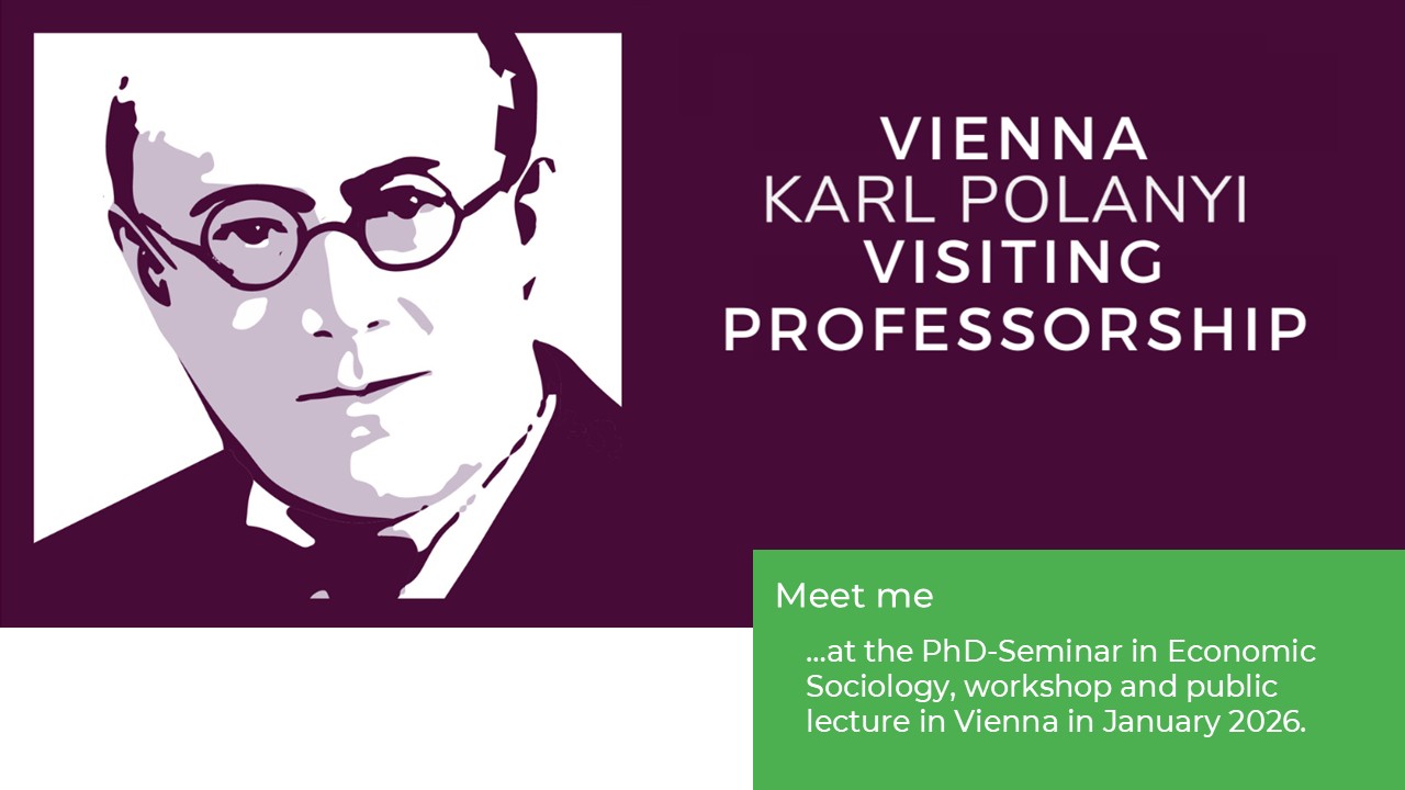 I am honored to be the 10th Vienna Karl Polanyi Visiting Professor for the fall term 2025. During my visit, I will hold a PhD-seminar, a workshop at Central European University and a public lecture. The topic of the PhD-seminar will be “Markets, Morals and Norms: Social and Economic Exchange in the Digital Society”. The seminar will comprise lectures, class discussions, group assignments and student presentations. It will revolve around the question how digital and social transformations reconfigure the foundations of economic life.